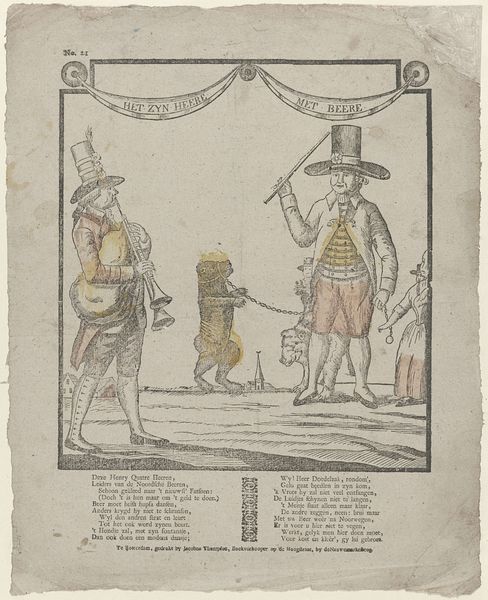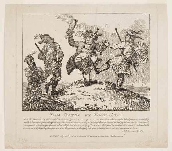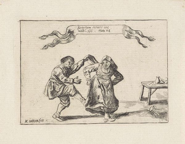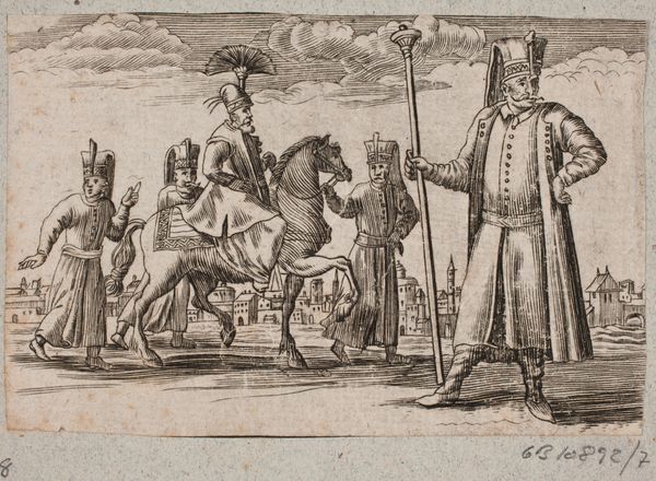 Editor: This is "Callot figures; two children carrying a cartouche to left, a dwarf in a plumed hat carrying a standard at right, from 'Six grotesques'," an engraving made in 1684 by Agostino Mitelli II. The figures look like caricatures from a carnival procession. What can you tell me about this work? Curator: Well, its humor speaks volumes about the evolving role of art in society during the Baroque era. Think about it: courts and the church still exerted tremendous influence, yet here’s Mitelli, engaging in caricature, a form of social commentary previously confined to more private circles. How does this strike you, knowing its political moment? Editor: I suppose I'm surprised. Were people free to create art criticizing the elite? Curator: Not exactly "free," but the lines were blurring. The market for prints expanded rapidly, so while royal patronage remained important, artists also sought wider audiences through satirical pieces like this. Consider the tradition of commedia dell'arte—would that give you some context? Editor: Yes! The exaggerated features and costumes are similar. I guess it makes sense that the artist would make political comments in caricature, reaching an audience through print. Curator: Precisely. The ‘grotesque’ aesthetic allowed artists to push boundaries. How do you interpret the presence of the two children flanking the central cartouche? Editor: Well, given what we've discussed, perhaps they symbolize innocence being exploited, or burdened by authority, even if playfully? Curator: That’s astute. By placing seemingly harmless figures within this tableau, Mitelli highlights the societal impact of power. Did the art change how you thought about historical norms of the 1600s? Editor: It really does. I came into this thinking that the powerful were distant from ordinary people, but even back then artists took bold creative risks. Thanks for providing socio-political context; I'll definitely use that information.