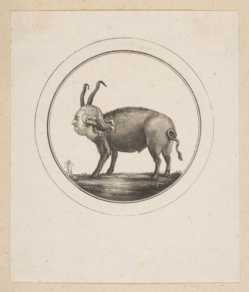 Curator: What an oddity! A peculiar rendering of a feline, somewhat unsettling I'd say. Editor: Odd indeed. Look at the quality of the engraving, the crisp lines that delineate fur and flesh… yet there’s a tension in how these materials come together. A critique through craft, perhaps? Curator: Indeed. This engraving, dating sometime in the 18th century, presents us with a "Caricature Showing the Comte de Provence as a Cat." It's an anonymous work residing here at the Met. Editor: "Le Chat" it's called there below the creature… It really underscores the comparison. What does it mean to render nobility so animalistic? A loss of status? An association between elites and… the comforts of cats? Curator: Caricatures during this period were often potent tools of political commentary. To depict the Comte, a member of the French aristocracy, as a cat... it speaks volumes about perceptions of his character or actions within the tumultuous social landscape of pre-revolutionary France. Consider the role of printmaking itself: inexpensive reproductions enabling wide dissemination of such images, stirring public opinion. Editor: The means of production matter. That such a delicate, detailed print could be replicated to stir public debate. But also note how even with the fine line work of the engraving process, this is crude… meant to be consumed by the masses. High art gone low by subject and process both. Curator: Exactly. We are presented not merely with an image but a piece of political propaganda. How effective do you think this would be? What sort of message do you imagine it sent to its viewers? Editor: I’m drawn back to the cat-like qualities—arched back, tucked tail… it feels defensive, ready to bolt. Is that about his politics, or just simple classist criticism of royal aloofness and comfort at the cost of other's labour? Curator: I believe the power of caricature lies in that ambiguity, enabling multiple interpretations shaped by individual beliefs. And indeed to highlight an image like this really enables moderns to think critically about those interpretations themselves. Editor: Yes! In considering process, materials, and politics—this unassuming print is surprisingly dense with critique. I look at it a bit differently now! Curator: And that’s the real value isn’t it? Engaging the past not just as it was, but what it can say about power today.