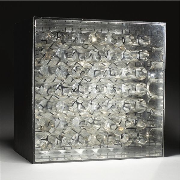 Curator: Before us is "Mercuriale," a 1970 sculpture crafted by Grazia Varisco. The piece is largely constructed from metal and embodies elements of kinetic art. What’s your first take on this? Editor: Intriguing. I’m immediately struck by the interplay of light and shadow—the geometric pattern almost seems to ripple. It projects an organized yet somewhat fluid character; I sense movement even though it is static. Curator: Yes, Varisco, associated with both the Arte Povera and the Kinetic Art movements, has always explored the fusion between material and perceptual phenomena. The repetition and subtle shifts within the pattern nod towards industrial processes but is contrasted by organic textures. It's art about its own making. Editor: From a formal point of view, it looks like those polished forms laid on top of the grid structure interact dynamically. They play a game of light that almost distracts one from recognizing this repetition, its own pattern—breaking up the grid into unpredictable highlights. How do these choices relate to social issues? Curator: The materials employed are essential; Arte Povera frequently chose commonplace substances to question commercial values within the art market and beyond. Her use of metal invokes ideas around mass manufacturing while being shaped, in this sculpture, by the artist. Editor: And there is the Minimalism influence, evident in its elementary shapes and understated character that draw us closer, deeper into visual observation, a structuralist game if you may, of decode and construction. It allows, like the art of Donald Judd, a space to experience perception itself. Curator: Quite right. These were works created at a point where technology influenced art and there were also critical perspectives arising in relation to it. It invites us to ponder about humans' labor inside the technological progress; progress never detached from labour conditions. Editor: Examining it in such detail illuminates layers that a cursory viewing simply misses. Thank you for elaborating on its cultural production. Curator: My pleasure! It demonstrates how closely interwoven form and social awareness could be within Varisco’s oeuvre.