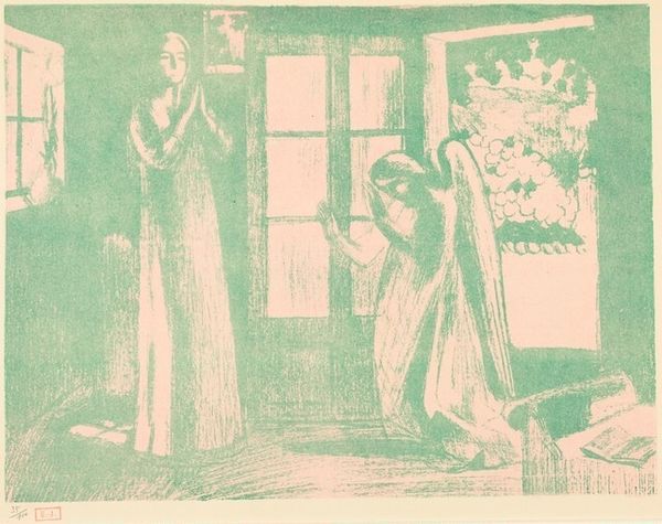 Curator: Here we have an untitled print by Barnett Freedman. It resides here at the Tate, and I find it so evocative. What are your first thoughts? Editor: Eerily beautiful. The high contrast makes it feel like a dream, or maybe a half-remembered film noir scene. Curator: Freedman was a master lithographer. Notice how he uses colour—or its absence—to create mood. The figure almost emerges from the darkness. Editor: That pink border seems like a trick, though. It flattens the picture plane, emphasizing the print’s materiality rather than any illusionistic depth. Curator: Maybe that tension between depth and surface is part of the point! It’s like he’s inviting us to consider the act of seeing, the artifice of representation itself. Editor: Well, it certainly forces you to look closely and appreciate the textures he’s conjured. A haunting piece, overall. Curator: Yes, definitely. I find that it continues to reveal itself the more I look.