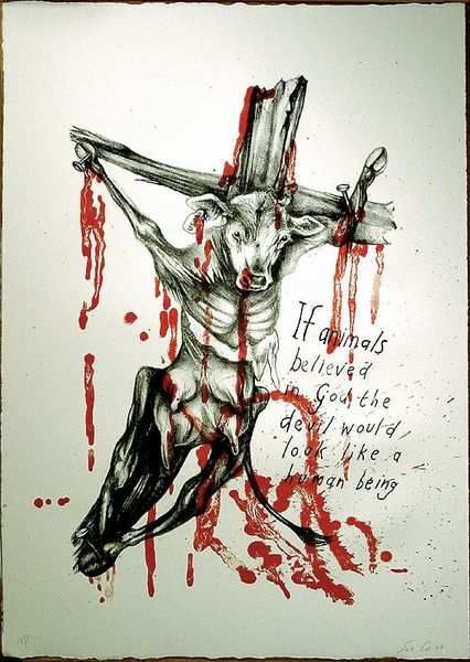 Carlos Sablòn made this painting, “La Joie du Sacrifice”, with paint on canvas. It is built up with a complex palette of dark greens and browns. The mark making has a beautiful simplicity. The surface of the painting is richly textured, it almost feels topographical. The background is made up of browns and greens, a kind of mysterious mulch, and the figure of a man in a pale blue suit is nailed to a cross, blood trickling down the surface, giving the painting an intense physicality. I love the tension between the material reality of the paint, and the implied narrative. Look at the way that the artist has depicted the man's shirt and tie, so crisp and clean against the deep and dirty background. Is this a nod to Magritte and his deadpan surrealism? It feels like Sablòn might be having a conversation with other artists across time and space, and that's what makes art so endlessly interesting.