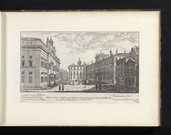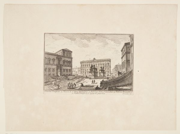 Curator: This is Giovanni Battista Piranesi's "View of the Theater of Marcellus," an etching and engraving completed sometime between 1741 and 1748. Editor: It feels melancholy, almost haunted. The sharp lines and heavy shadows create this sense of grandeur decaying, of history weighing down the present. Curator: Exactly! Piranesi was obsessed with Roman antiquity. The etching uses exaggerated perspective and dramatic lighting, drawing the viewer into this almost theatrical space. He really wanted to communicate the emotional weight of history. Editor: And it works, but to what end? We see the Theater of Marcellus not as a glorious monument but as a ruin repurposed, swallowed by the modern city. Are we meant to mourn this loss, or to question the very nature of imperial power structures, reflecting on the violence inherent to their construction? Curator: Perhaps both? Piranesi's imagery taps into the psychology of ruins. He saw Rome not just as it was but as a palimpsest of all its past iterations. Note how he populates the foreground with tiny figures, dwarfed by the architecture. Editor: Yes, those figures are key. They highlight the continued presence of life amongst these ruins, yet they're also passively moving about—complicit perhaps in overlooking history? They embody this tension of carrying on with everyday life against a backdrop steeped in powerful but potentially forgotten or misunderstood histories. Curator: Right, symbols become reinterpreted over time; power shifts. Editor: Well, this piece forces me to confront the uncomfortable aspects of heritage: who gets to control the narrative, and how does the past continue to shape the spaces we occupy and the power structures around us. Curator: I find Piranesi so adept at speaking across centuries; a timeless piece offering so many pathways of exploration into cultural memory and the ongoing role of the past in shaping our present realities. Editor: I see how it resonates across history. For me, this view insists that we stay conscious of history's influence and actively question the stories our built environments tell, demanding reflection on how societal values might become obscured by grand narratives and entrenched power systems.