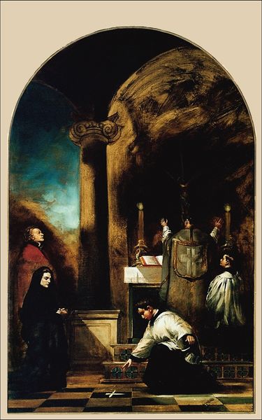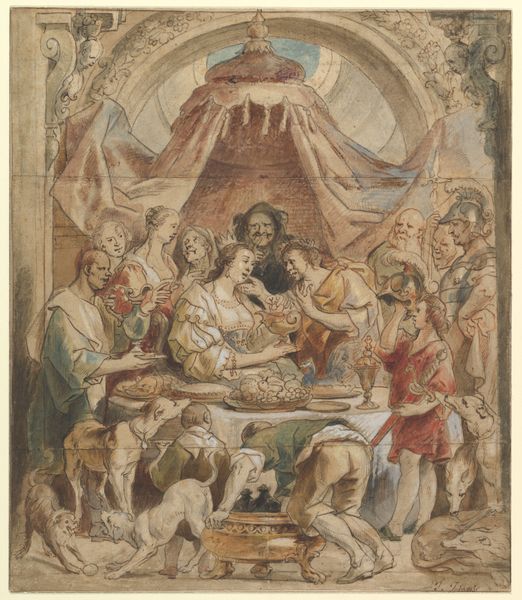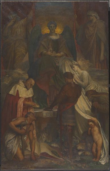 Curator: Editor: Here we have Albert Maignan's 1877 oil sketch, "Christ the Redeemer, Christ calls the afflicted to himself." The theatrical composition, with the idealized figure of Christ presiding over a crowd of sufferers, gives the painting a rather staged feeling to me. What strikes you about this piece? Curator: What's immediately evident to me is the clear display of labour—the labor of academic painting itself. Notice the underpainting still visible in areas. It exposes the process, the very materiality of art production. How does seeing it as a sketch rather than a finished piece change your understanding of its purpose, of its making? Editor: That's a great point. Knowing it’s a sketch does shift my focus. It becomes less about the finished product, about some grand, completed vision. More about… the steps taken. But how does this materiality speak to a broader social context? Curator: Well, think about the 19th-century art market. Academic painting was a commodity. Artists like Maignan were part of a system. Understanding the materiality – the canvas, the paints, the techniques employed - forces us to acknowledge this economic dimension. Even religious works participated in cycles of production and consumption. How might these factors have shaped Maignan’s approach? Editor: So, it's less about spiritual devotion and more about...craft and its market value? A religious message packaged within the prevailing academic style to appeal to a patron, to sell a painting, to be part of this materialist cultural complex...That does shift things. Curator: Precisely. Examining the means of production brings what may seem ethereal – faith, redemption – down to earth, to the world of studios, commissions, and the economic realities of the artist’s world. Considering art this way brings up some fundamental questions. Do you see any value in this approach? Editor: Definitely. It challenges this notion of the artist as purely inspired, highlighting the craft and the socio-economic factors that shaped their creations. It gives us a better insight. I am glad to think of it as part of our everyday culture. Curator: Absolutely, it is a great shift. And I've become more appreciative of the skill required for paintings like this.