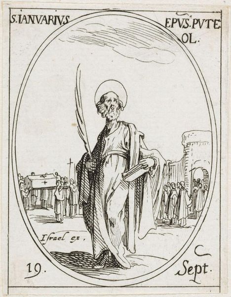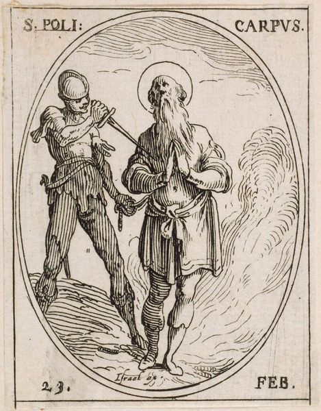 Editor: This is Jacques Callot's "Saint Joseph," a small etching. The figures seem both delicate and solid. What historical narratives are at play here? Curator: Callot made this print during a period of intense religious and political upheaval. How does the depiction of Joseph, usually a background figure, challenge patriarchal structures? Is the tenderness he shows Jesus a reclaiming of masculinity? Editor: That's a fascinating perspective. It makes me reconsider the power dynamics within the image. Curator: These images weren't neutral; they had a purpose. Considering Callot’s political and social environment, it changes how we perceive the image, don't you think? Editor: Absolutely. I see so much more now! Thanks for sharing your insights.