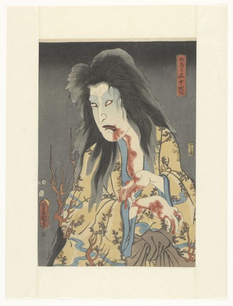 Curator: This dramatic woodblock print is “The new Taira emperor Masakado,” crafted between 1849 and 1852 by Utagawa Kunisada. It’s part of the Rijksmuseum’s collection. Editor: Whoa, it’s intensely theatrical, isn't it? That frozen expression, like he's caught between fury and fear… Curator: Precisely. Kunisada was a master of Ukiyo-e, or "pictures of the floating world," a style that frequently portrayed Kabuki actors in dramatic roles. Editor: The figure feels monumental, despite presumably being relatively small, like it captures more than the paper allows... Is he really staring at two headless figures there or am I just seeing that? Curator: That's right, yes. Those disembodied heads hovering beneath the moon play upon a legendary account wherein Masakado was decapitated, but his head flew around for some time. The figure is powerfully rendered in dynamic composition. Editor: So the dramatic colors in the kimono - I read phoenixes and elaborate foliage? It amplifies that raw emotion – maybe even overblown with so much ornamentation! The whole scene becomes incredibly evocative given those spectral forms hovering nearby... Curator: It’s a clash of opulence and horror, typical of Kunisada. His use of strong outlines, vivid hues and decorative patterns create depth, even within the flat perspective of the print. The rich color and fine detail of the phoenix are particularly compelling. Editor: Seeing it like that gives me new eyes—it's less a document, and more like tapping into a specific feeling from a past now lost to time. This makes me want to explore other works from that moment even though this wasn’t the piece that I had wanted to see on display. Curator: Utagawa Kunisada presents us with so much more than merely history; we have received an embodiment of both myth and visceral experience. It is certainly why the woodblock work retains its profound presence even now.