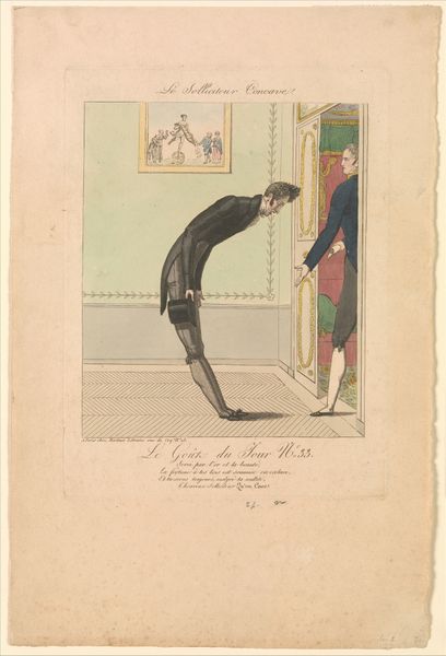 This lithograph captures a moment of strained supplication; a figure bent almost impossibly backwards, hat cast aside, a scroll discarded, all in the hopes of gaining entry through the barred window. Consider the motif of the barred window, a symbol of exclusion and frustrated desire that has haunted artistic creation across epochs. We see it echoed in medieval depictions of the imprisoned soul, yearning for divine grace, and in the Renaissance portrayals of Lucretia, trapped by societal constraints. The bars, acting as a psychological barrier, reflect our primal fears of confinement. Here, the grotesque bending of the petitioner’s body, the act of pleading itself, represents a universal human experience, a desperate yearning that is both personal and reflective of broader social dynamics. This image is not simply a scene, but an echo, a carrier of a powerful emotional and psychological weight that engages us on a subconscious level. Its cyclical progression allows it to resurface and evolve, accruing new meanings in different historical contexts.