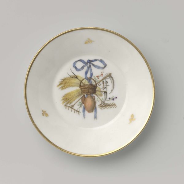 This teacup saucer was crafted at the Koninklijke Porseleinfabriek Dommer & Co. with delicate brushstrokes. The eye is immediately drawn to the centralized arrangement of objects, bound together by a soft blue ribbon, creating a sense of organized chaos within the circular frame. The objects depicted—instruments of leisure and perhaps war—are rendered with a muted palette, contrasting with the bright gold rim. The choice of porcelain as a medium lends a sense of fragility and refinement, characteristic of the era's material culture. Consider how this composition invites us to decode its symbolism: the drum, guns, and other accoutrements, each carefully placed, may signify aspects of aristocratic life. Placed against the pristine white background, these elements achieve a complex interplay between form and function, luxury and martial prowess. Note the deliberate placement and how it functions aesthetically and as part of a larger cultural dialogue about the values and material obsessions.