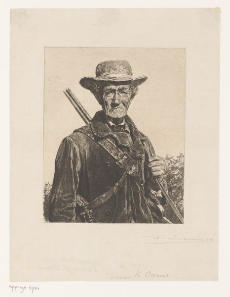 Frans Lauwers made this print of an unknown old man with a hunting rifle sometime between the late 19th and early 20th centuries. This image reflects the cultural values and social structures of its time. In many European societies, hunting was historically associated with the aristocracy and land ownership, serving as both a sport and a symbol of power. Lauwers, working in Belgium, may have been commenting on the changing social dynamics of the time, with newly wealthy bourgeoisie appropriating aristocratic pastimes like hunting. The man's advanced age also suggests a reflection on the passage of time and the changing social roles within a community. It is important to remember that art like this is deeply embedded in cultural and historical contexts. To understand Lauwers' work more fully, we need to consider the social and economic conditions of Belgium at the turn of the century. By exploring archival sources and social histories, we can better appreciate the complex layers of meaning within this portrait and its commentary on the transformation of social norms.