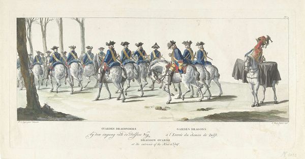 Editor: This print, titled "Lijkstatie van Willem IV, 1752, plaat 3," created by Jan Punt in 1752, depicts a stately procession of horse guards. It's rendered with etching and engraving. The repetitive nature of the composition strikes me. What do you see in the print? Curator: Indeed, the repetitive figures lend the piece a striking formal quality. The artist has rigorously employed line and form to achieve this effect. Observe the regimented rows of horses, each stride mirrored in its neighbor. Notice also how Punt uses the negative space—the emptiness between and above the figures—to further accentuate this linearity, emphasizing the forward motion of the procession. Editor: So, you're focusing on the structural elements rather than the event being depicted? Curator: Precisely. While the subject, the funeral procession of Willem IV, is undeniably significant historically, I’m drawn to how Punt uses the formal language of art to convey a sense of order and somber dignity. Note, for instance, the subtle variations in the postures of the horses and riders. Are these intended to introduce variety, or do they merely disrupt the overall rhythm? Editor: I see what you mean. The variations do disrupt the rhythm somewhat, adding a slight tension to the piece. I had not considered that tension to be part of the artistry until you mentioned the artist's structural goals. Curator: And what does that tension contribute, would you say, to the viewer’s interpretation? It’s these compositional elements, line, form, and tension that build meaning, independent of any narrative considerations. Editor: It adds complexity. The regimented order clashes with the slight chaos. Now, reflecting on the artwork again, I see more clearly how it’s designed around form rather than simply an event recorded in ink. Thank you for this analysis! Curator: My pleasure. I find new insights with each analysis, also!