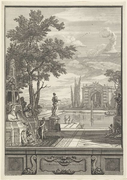 Curator: Let’s take a moment to consider "Parkgezicht," a drawing rendered in pen, pencil and grey wash attributed to Isaac de Moucheron, dating sometime between 1677 and 1744. What are your initial thoughts? Editor: Dreamy, a little melancholic. All those elegant figures lounging, but somehow…isolated? It feels like a stage set waiting for a drama. The light, muted tones only add to this effect, it's not as alive as it could be for a garden. Curator: Indeed, this drawing exemplifies the Baroque garden design of the period and the complex social hierarchies reflected within such constructed landscapes. The aristocracy sought to exhibit power through gardens. De Moucheron’s landscape drawing illustrates these very controlled environments that offered specific, intentional social scripts. Editor: Scripted leisure, right? All those sculptures gazing out like they're overseeing a particularly dull play. There's a wonderful sort of voyeurism here. Curator: Certainly. The gazes intersect in ways that speak to systems of surveillance as well as privilege. We could look at this through a feminist lens, noting how women are positioned, in what activities they seem to participate, and how their visibility intersects with class status in this hyper-structured, male-dominated landscape. Editor: It definitely feels coded. I imagine myself stepping into this drawing – but where do I even fit? I feel very much like an outsider gazing in, trying to decode the garden’s visual language. Curator: Right – this controlled natural world offers an intriguing visual text that embodies both aspiration and exclusion. This type of spatial control, where certain groups are granted access, and other groups, restricted, informs everything from city planning to resource distribution today. Editor: It makes you wonder, doesn't it? Whose gaze are we even meant to align with? I mean, is it the artist's, who so precisely recorded all this rigid elegance? It's so…self-aware somehow. Well, thanks, I feel unsettled, thoughtful, ready to question the social choreography of my next garden visit. Curator: My pleasure. Examining de Moucheron’s drawing beyond its aesthetic value unveils important commentary on how power operates within the built and natural environments, making it exceptionally relevant to the contemporary world.