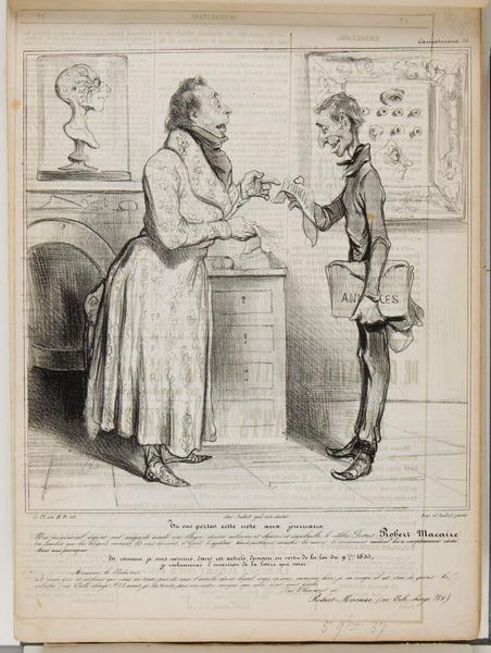 Curator: This is "Let's go! My young friend, a good handshake . . .", by Honoré Daumier. Editor: It's funny how grotesque he's made these figures, all spindly legs and huge noses! Curator: Daumier was, of course, a master of caricature, and he used his art to critique French society. This piece, like many of his works, likely takes aim at the pretenses of the bourgeoisie. Editor: Absolutely, the fellow on the left looks like he's about to be eaten alive. He's leaning so far forward, positively quivering! Curator: It’s a commentary on power, and how these social interactions often mask underlying inequalities. Editor: Well, I know whose hand I wouldn't want to shake first. Curator: Indeed, Daumier's insight into human nature remains relevant, doesn’t it? Editor: Even today, the handshake can be a symbol of so much more than simple greeting.