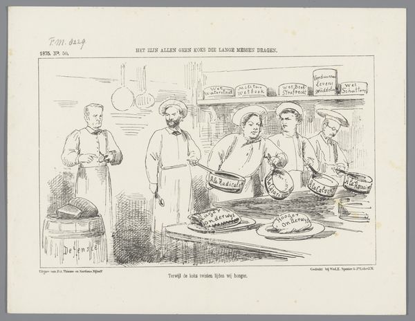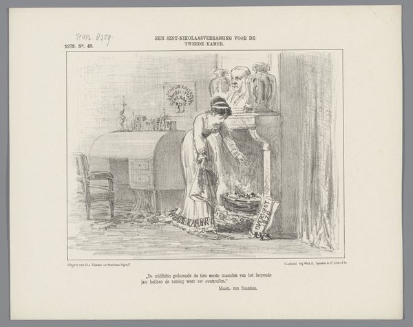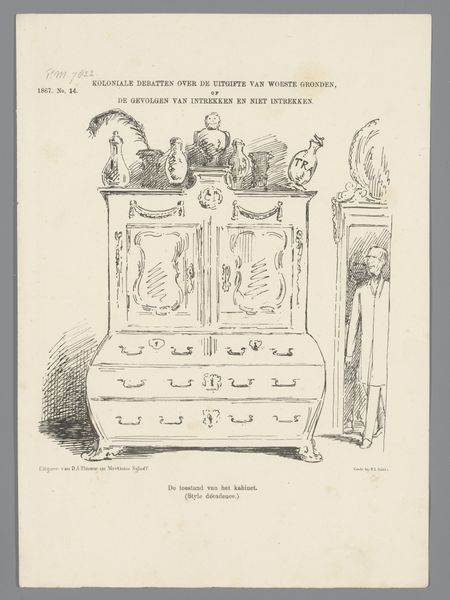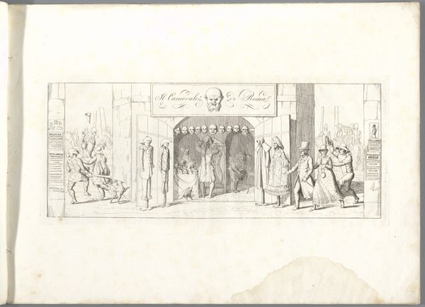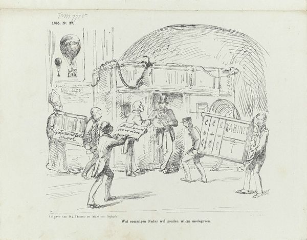 Curator: At first glance, this reminds me of an anxious dream! Editor: We're looking at "Spotprent op het oude ministerie," which roughly translates to "Cartoon on the Old Ministry," a pen and print drawing from 1867 by Johan Michaël Schmidt Crans. It certainly feels like peering into a somewhat troubled mind. Curator: Exactly. The rough sketch lines give it an immediate sense of unrest, don’t they? The fairground motif with that oddly placed bathtub… it’s all just slightly off-kilter. Are we meant to see the ministry as a sort of chaotic circus? Editor: I think that's very perceptive. Caricatures like this one often used popular imagery – the circus, the fair – as stand-ins for the "the world," so to speak. The drawing seems to suggest those in power just keep the wheel turning, going in circles, no matter how absurd or disconnected from reality it seems to those trapped on the outside. Notice that phrase, literally under the image: “The people in the merry-go-round: Let us always continue turning, that way, they can't get into it”. Curator: I hadn’t focused on that before! It adds a darker dimension. The composition cleverly separates the detached onlookers from those on the merry-go-round, deepening the sense of division. I mean, a lion wearing a fool's hat?! Editor: Right? It could symbolize a ruler humiliated or public figures exposed. Think about the Romanticism movement at the time; artists explored raw emotional states, social critique… it makes sense this artist adopted such whimsical visuals to deal with some serious subject matter. Curator: Absolutely. Romanticism had that element of escapism as well, though maybe twisted and presented here. It asks what roles the powerful are meant to perform. Editor: Thinking about how our society keeps replaying familiar dramas through different costumes or settings, you can feel how timely its message would still be if this drawing were new today! Curator: Indeed. It’s interesting to see how visual symbolism continues to be such a valuable resource when criticizing sociopolitical power structures and the emotional impact of them. Thank you! Editor: Always a pleasure; it’s why I enjoy looking back through these artworks as windows into where we might be heading as a society.