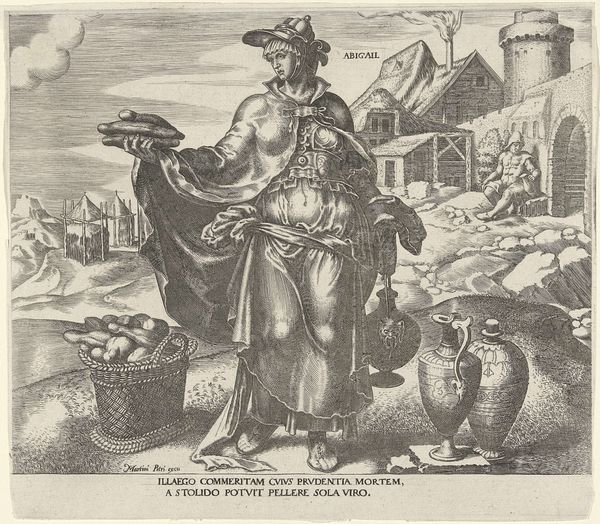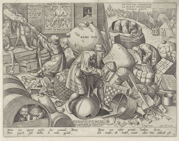 Pieter de Jode's engraving, "Het sanguinisch temperament," presents us with a scene rich in texture and symbolic composition. The detailed lines create a sense of depth, drawing our eye across the tableau of figures and objects, all unified by a network of fine hatching. The image is structured around the central figures of a man playing a lute and a woman reading, their forms creating a balanced yet dynamic interplay. De Jode uses contrasting textures to differentiate elements: the soft, flowing garments against the hard, polished surfaces of the musical instrument and the fruit bowl. This contrast isn't merely decorative; it creates a semiotic tension, setting up a dialogue between nature and artifice, leisure and intellect. The background landscape, filled with dancing figures, operates as a signifier of the sanguine temperament itself, lively and spirited. The print functions as a system of signs, inviting us to decode its cultural values and philosophical underpinnings. Note, for example, how the meticulous detail serves not only to depict but also to elevate, turning an everyday scene into a discourse on human nature and its representation.