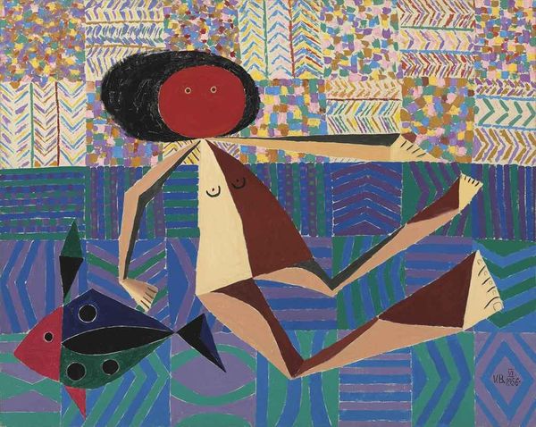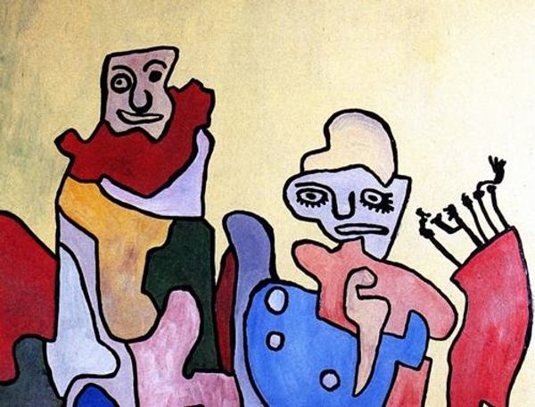 This is a painting by the Dutch artist Corneille, probably made sometime in the mid-20th century. It shows two rather strange, colorful figures set against a divided red and blue background. Corneille was a founding member of the Cobra group, whose work was often characterized by a rejection of academic and institutional artistic values. Cobra artists favored spontaneity, experimentation, and the incorporation of folk art traditions. The painting employs a deliberately crude, childlike style which was a reaction to the horrors of the Second World War. The imagery, though not directly representational, draws on universal symbols to comment on the human condition. It is a move towards freedom of expression. To understand this painting better, we can consult manifestos, exhibition catalogs, and artists' writings from the Cobra movement, as well as historical studies of the post-war European art scene. This work reminds us that art is always embedded in social and institutional contexts.