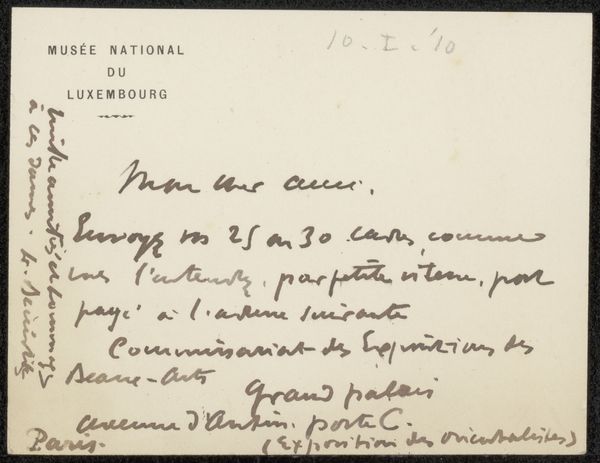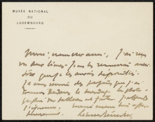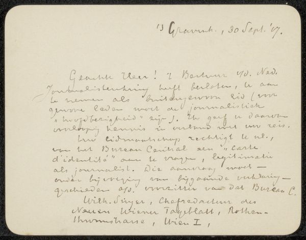 Curator: This drawing, "Brief aan Philip Zilcken," possibly from 1901, is rendered in ink on paper. Notice the texture created by the weave of the paper and the varying pressure of the artist’s hand. What stands out to you? Editor: It's the handwriting, I think. The loops and curves are so expressive, and the density varies across the page. What do you see in it formally? Curator: The density creates a field, doesn't it? The visual rhythm created by the rise and fall of the script's line. See how the upper part has that dark section where one word is written right after the other? The marks almost seem to take on a life of their own, quite separate from any textual content. Is there any balance created by those varied elements? Editor: Well, the lighter areas balance out those denser patches you mention, so I suppose that creates some distribution or symmetry? Curator: Precisely. The blank space around the perimeter becomes essential; it isolates the core, intensifying our focus on the interaction between positive and negative forms. Look at how the upper left and right, while having some visual markers, yield to that sense of negative space. It frames the overall gesture, would you agree? Editor: Definitely! The letter feels almost sculptural, because of the arrangement of dark versus light and how those combine with negative space. I see a dynamic tension between text and pure visual form. Curator: Yes, indeed. In ignoring its contextual meaning, the piece achieves its unique value, existing as shapes instead of information. We come to value materiality first and foremost! What have you gained from viewing it in that way? Editor: Seeing it that way…it lets me appreciate the hand of the artist. Separated from meaning, the material rendering creates all new areas for interpretation. Thank you!