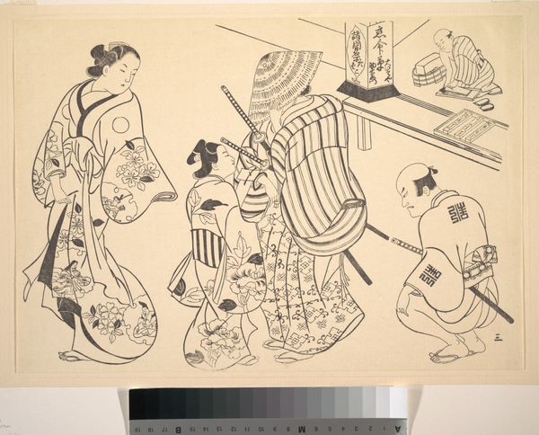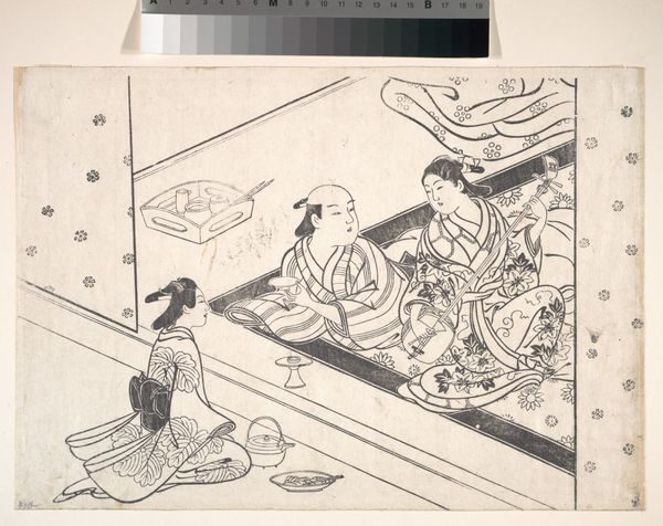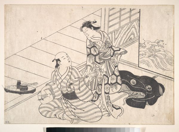 Okumura Masanobu created this black ink on paper print, “An Oiran Seated in a Parlor Applies the Fire Treatment to the Bared Back of Another Woman.” The composition is structured around the dynamic interaction of three figures arranged across a horizontal plane. Note the linear quality of the print; the stark black lines defining the figures and interior elements create a contrast against the blank paper. The print's texture is a direct result of its medium, which gives it a tactile quality. Consider how Masanobu uses line and form to depict the social rituals of Edo period Japan. The act of applying the fire treatment becomes a symbolic representation of care and intimacy. The spatial arrangement, with figures closely positioned, invites us to consider the codes of social relationships. This print invites us to examine how art captures and communicates the subtleties of human connection within specific cultural contexts.