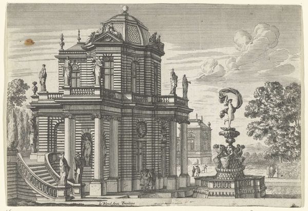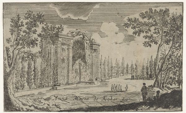 Curator: Let's discuss this piece, "Tuindecoratie in de vorm van triomfboog," an engraving created before 1657 by an anonymous artist. Editor: It's surprisingly engaging for what it is—an engraving. The textures practically leap off the aged paper. The overall symmetry is extremely well executed, producing a great level of artistic depth for a mere landscaping plan. Curator: Indeed. Its formal qualities reveal much about Baroque aesthetics, the carefully delineated landscape, and the structure of the triumphal arch, an allegorical element celebrating power, achievement, perhaps, a moral and/or physical victory? Editor: Looking at this triumphal arch, I think of labor, of course. Look at the people; this is the material culture of making. How did this design become physical, at human scale, and what sorts of technologies would that kind of process involve? I notice details like the rendering of foliage which must've taken a huge degree of artisanry, never mind building it! Curator: Observe the balanced composition, and its linear precision drawing the eye to the arch. Semiotically, this ordered, man-made architecture imposes on the unruliness of nature itself, or vice-versa. The landscape is itself arranged and formal, as we see in the bordering copse of carefully arranged trees! There are hierarchies at work both pictorially and spatially, here. Editor: But I wonder about accessibility. The elite are on horseback, enjoying the architecture while some other folk are tending to animals at the margin. It’s worth considering the production chain—who built it and who it was for— and whether the social values inherent to its use are encoded in the design, since this an artwork on its own. Curator: An important point about labor relations! To return to form: consider how the lines give us shape, light, and shadow, and the perspective invites us to think about the relationship between foreground and background as representing real-world social divisions, but through the artist’s decisions. Editor: Well, the means of representing the image had its limits, too, for sure. The engraver is interpreting something physical. Seeing the different kinds of labor pictured here, I would find it difficult not to recognize a claim of art's laboriousness, not despite it being representational but precisely because the engraver worked hard to create a perfect illusion of an image! Curator: Fascinating. On balance, it underscores that analyzing the structure helps unpack meaning. Editor: Agreed! The convergence between artistic license and material constraints in its making tells us a different kind of story.