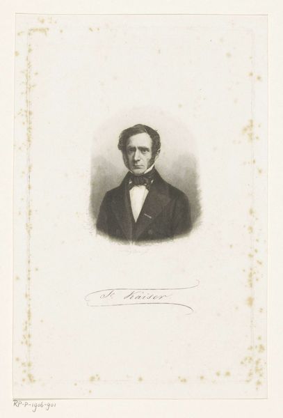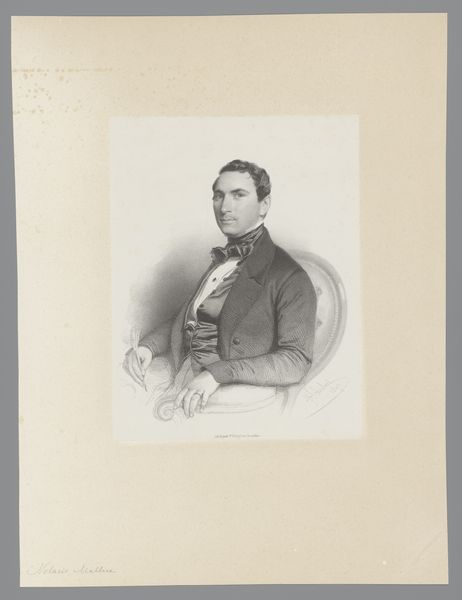 Curator: Here we have a lithograph entitled "Portret van John Bake" by Johannes Christiaan d' Arnaud Gerkens, dating from the period 1833 to 1891. It's part of the Rijksmuseum collection. Editor: My first impression is one of guardedness. His expression is somewhat inscrutable, a touch melancholy. It's beautifully rendered though, the light catching his face creates a very compelling presence despite the stark medium. Curator: It’s interesting you mention that. Portraits during this time served not only as representations but often as deliberate constructions of identity and status. The sitters' pose, attire, and even the lighting all contributed to conveying a particular image— one of authority, refinement, and belonging. John Bake’s social standing undoubtedly informed the composition here. Editor: The tight, dark knot of the bow tie, the severe cut of the jacket... they strike me as very potent symbols of social constraint. There’s an attempt at capturing realistic likeness, yes, but through a filter of rigid expectations. You sense an individual confined by the visual codes of his time. Curator: I think that is key. To analyze it further, the piece offers commentary on gendered expectations and power dynamics inherent in portraiture, and representation of the individual through state. We see this most prominently in what this man does or doesn't wear; that speaks to his conformity to ideals about bourgeois masculinity, influencing perception in the broader Dutch culture of the time. Editor: And notice how the artist softened the contours. He uses the medium not to show a hyperrealistic face, but something a little more, creating symbolic weight that exceeds just representing how the sitter literally looked. I see an idealized presentation, one where even the individual’s psychological depth becomes another symbol—that of the respectable citizen. Curator: Indeed, this work, through its very careful presentation, invites a deeper understanding of not just John Bake as a person, but the societal currents shaping his portrayal. It subtly deconstructs those very concepts through the lithograph medium. Editor: Well, considering all the symbols within, there is a clear sense of history distilled within the man's visage. Curator: A compelling synthesis of artistic presentation, and historical contextualization for engaging in our understanding. Editor: Indeed; layers of history, beautifully encoded in monochrome.