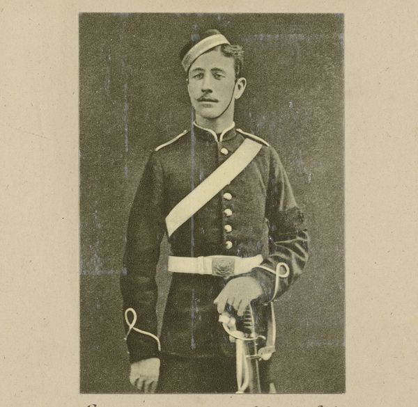 Curator: This intriguing portrait, titled "Arthur Moos met chapka en sabel in het uniform van het Duitse leger, met het IJzeren Kruis op de borst, gezeten op een stoelleuning, december 1914," captured through the medium of a gelatin-silver print, dates back to the pivotal year of 1914. What strikes you most about it initially? Editor: The stark tonal range immediately catches my eye. The figure, seemingly caught between youth and war, possesses a rigid posture and severe mien. Curator: The historical context is critical. We see a subject who likely had been pushed by societal forces, at the beginning of World War One, into the image of a militarized patriot, yet his slight frame and gentle eyes betray a vulnerability that complicates any simple interpretation. He might even have been ambivalent, but social expectations would have expected him to pose heroically. Editor: Indeed, it is impossible not to notice the tension in the way he is posed. From a purely formal perspective, notice how his form is bisected by the hilt of his sword, dividing our reading into two registers, martial ambition, youthful reluctance. His eyes lead me toward German Expressionism by his unsettling stare. Curator: German Expressionism offers us another layer through which we see it. The early 20th century in Germany fostered diverse identities reacting to their social settings. This portrait adds nuances to understanding responses to wartime pressure by exploring inner conflict. Editor: And that uniform…It’s practically luminous against the backdrop, almost iconic. It could be read, semiotically, as both signifier of power and tragic vulnerability. Curator: His gesture—that casual yet firm grip on the sword—tells such a nuanced story. One wonders about his experience within the machinery of war, the ideals challenged, the self reconstructed under pressure of events, of wartime nationalism. It speaks about cultural influences within wartime photography and society at that moment. Editor: It does raise complex questions about identity. As a cultural artifact it embodies an aesthetic unease typical of German Expressionism, in capturing internal tension in the outer self and vice versa, blurring easy interpretations. Curator: Indeed, examining such visual history enhances understanding of cultural nuances during conflict; from national imagery construction to hidden humanity. Editor: Agreed, a potent mix—it serves as a window into a young man's story within war's complex tapestry.