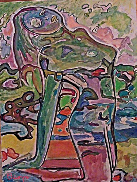 Cricorps made "Amour maternel" with what looks like oil paint, and it's a real celebration of colour. The surfaces are built up with thick layers, giving it such a tactile feel. Looking closely, you can see how the paint is applied almost like little tiles, especially in the figures. It's as if the artist is building up this scene, one careful stroke at a time. The palette is warm but kind of unexpected – mauves, pinks, and earthy browns, all blending together. See how the embrace of the mother and child is composed of geometric shapes? This way of segmenting the forms gives the piece a kind of raw emotion, as if the artist were feeling their way through the process. It's like a stained-glass window, each color and shape piecing together to make this intimate moment. The way Cricorps approaches colour and form reminds me a little of Sonia Delaunay; that shared interest in how colour creates depth and movement. It's a beautiful reminder that art is always a conversation.