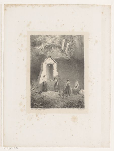 Editor: This gelatin-silver print, taken sometime between 1890 and 1910 by Henri van den Broeck, is titled "Tourists at the entrance of the Kohlscheuer cave near Echternach, Luxembourg". It's fascinating to see these figures posed against such a rugged, natural backdrop. What symbolic weight do you find embedded within this particular setting? Curator: The cave itself is profoundly symbolic. Across cultures and throughout history, caves have represented the unconscious, the unknown, a place of initiation and transformation. Consider the group of figures juxtaposed against this cavernous space – they stand at a threshold. Editor: A threshold between what? The familiar and the unfamiliar? Curator: Precisely! And also, perhaps, between a world increasingly shaped by modernity and the enduring power of the natural world. Notice how their attire suggests a certain formality, a 'Sunday best', amidst this primal setting. The stark contrast speaks volumes about humanity's perceived relationship with nature at the time. Are they conquering or merely observing? Editor: It's interesting you mention "conquering," because the man standing on the rock looks like he's posing, as if claiming it somehow. Do you think that's a deliberate gesture captured by Van den Broeck? Curator: I believe so. The pose isn't accidental; it's performative. It underscores the human impulse to assert dominion, to imprint oneself onto the landscape. But the cave remains, doesn't it? Constant, enduring. What is it saying about how we interact with places? Editor: I'm struck by how this photo captures not just a moment in time, but also layers of cultural assumptions and unspoken narratives about humanity and nature. Curator: Exactly. This is why it still speaks to us today. It isn’t just a picture of some tourists, it’s about our continuing dialogue with the environment and how that defines who we are, both then and now.