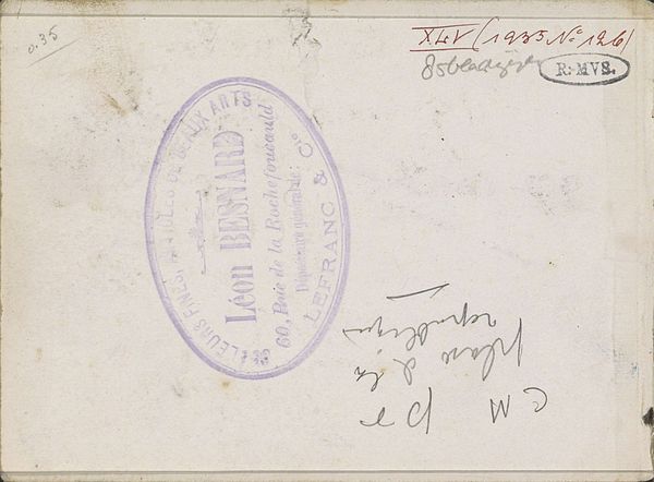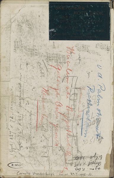 Editor: So this is Willem Cornelis Rip's "Landschap," sometime between 1866 and 1922. It’s a pencil drawing on paper. It's more like a sketch really. The jottings next to it suggest a personal document. What sort of meanings do you think can be drawn from this work? Curator: Indeed, a fascinating confluence of personal notes and landscape imagery. I am struck by how the handwritten notations almost compete with the drawn landscape. There’s a palimpsest effect, where layers of personal data obscure and inform the image. What visual or textual clues tell you this is landscape at all? Editor: Well, the trees mostly. Even though they’re sketched roughly, they evoke a sense of place and nature. But it's dominated by text. Are you saying the written text adds to the symbolism? Curator: Absolutely. Note the business stamp, "Th.J. de Koning, Kantoor & Papierhandel Den Haag." Consider how that anchors this personal scene to a specific time and place – The Hague, a stationers shop. Does it perhaps speak to a relationship between nature, documentation and perhaps, the professional life of the artist? Editor: So the drawing, combined with the handwritten notes and the business stamp, becomes more than just a landscape study? Curator: Precisely! These disparate elements invite a deeper reflection on memory, place, and the subtle ways our lives intersect with the world around us. It allows us to weave a cultural narrative around what appears to be a casual sketch. Editor: It’s amazing how much a seemingly simple sketch can reveal! Curator: Exactly, the symbolic power of visual fragments should never be underestimated.