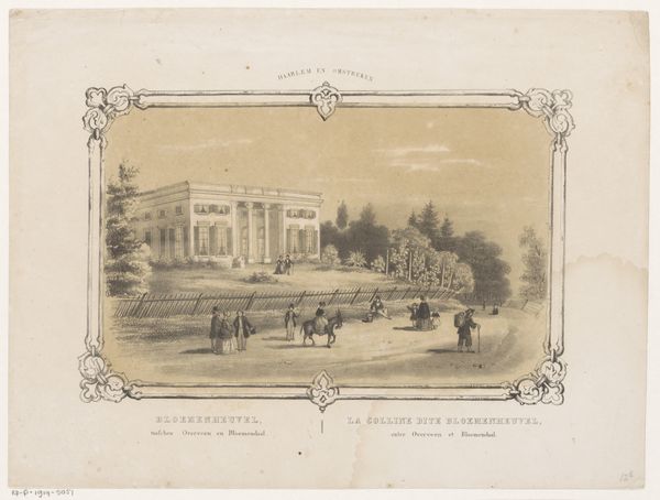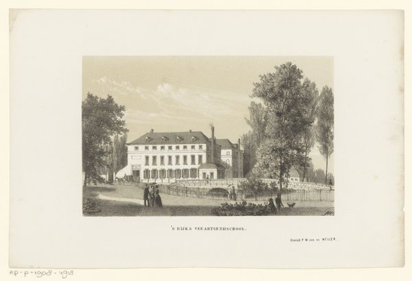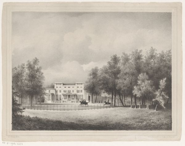 This is an undated print of Prince Alexander's palace by an anonymous artist. It offers a glimpse into the world of Dutch royalty, and the rigid social structures which shaped this world. Here we see the palace set back from a carefully cultivated landscape, with a small gathering of people in the foreground enjoying a stroll. It serves as a window into the visual culture of the Netherlands, capturing the formal gardens and classical architecture that symbolized wealth and power at the time. This representation of Prince Alexander's residence not only showcases architectural grandeur but also suggests the inaccessibility and distance between the monarchy and the general populace. The image serves as both a historical document and a cultural artifact, reflecting how the monarchy sought to present itself through art. What stories might these anonymous figures walking in the foreground have to tell us about the unseen labor and social conditions which supported such a lifestyle?