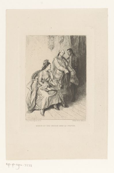 Editor: This is "Jonkvrouw en minstreel," made sometime between 1848 and 1910 by Willem Geets. It looks like it’s an engraving. The scene is quite intimate; it shows a noblewoman and a minstrel in what looks like her private chamber. What strikes me most is how the artist depicts the texture of the fabrics, what are your thoughts? Curator: The fabrics and other material possessions definitely dominate this image, don't they? I wonder what the specific types of cloth, the instruments, and other decorations tell us about the social and economic relations that existed between the jonkvrouw, the minstrel, and the artist himself. We must consider how each figure could afford the time and materials required in their work. Editor: So, it's about power dynamics being revealed through materials? I hadn't thought about that. It also speaks to the culture around art production and labor, right? The minstrel relies on the lady, and the artist, potentially, on both. Curator: Exactly. Consider also the choice of engraving as a medium. How does the reproducibility of prints impact the artwork's accessibility and its value in a material sense? Who could have afforded such engravings and what was the social context surrounding such imagery during its production? Editor: That’s a great point about the engravings being reproducible. So this artwork prompts us to think about the economics of artmaking and the layers of consumption during the period. It isn’t just about aesthetics, but about the systems behind it. Curator: Precisely. By examining the labor and the materials involved, we gain a richer understanding of the cultural narrative. It shifts our perspective from passive viewing to critical inquiry. Editor: I see it now; thinking about art in terms of its material existence and production, makes it a kind of social artifact. Thank you.