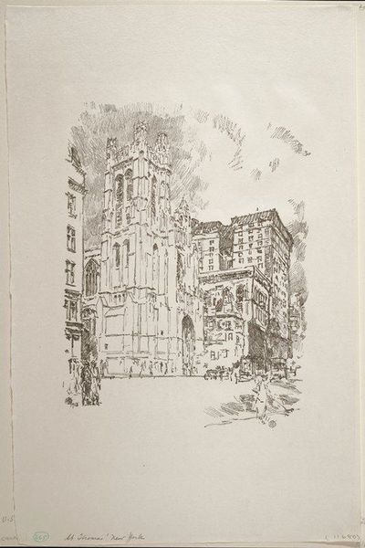 Curator: This drawing, “15th and Market Streets” by Salvatore Pinto, captures a bustling cityscape in a direct, almost journalistic manner. Editor: My immediate impression is one of faded grandeur, like looking at a memory through the veil of time. The line work is intricate, creating a sense of depth but also contributing to this dreamlike atmosphere. Curator: Considering urban environments historically, it's hard to divorce them from issues of social stratification. The figures here seem generic, yet their placement subtly indicates the different social strata coexisting but rarely mixing in such public spaces. There's also the undercurrent of urban development—its promises and failures. Editor: Absolutely. I'm drawn to how Pinto uses the varying thickness and density of lines. Note how the central clock tower dominates the composition, its imposing silhouette creating an undeniable focal point, while the figures in the foreground have comparatively minimal treatment. Curator: Which can be read through the lens of power dynamics. The city's architecture, especially its civic buildings like this tower, often embodies the establishment's power while everyday citizens navigate this structure. Pinto’s work provides insight into the experience of those negotiating city spaces dominated by structures designed to impress, and possibly control, urban subjects. Editor: Yes, it’s fascinating how such simple lines construct such a detailed and thought-provoking piece. It reminds me of a modernist sensibility where the bare bones of a subject are presented without elaborate decoration. It almost demands the viewer actively participate in its completion. Curator: Perhaps we might see in this image a kind of precursor to hyper-gentrification, with those monolithic buildings almost threatening to overwhelm human scale in that space. Editor: Indeed. Thinking about how the light and shadow are rendered through hatching techniques gives the buildings a weightiness that perhaps hints at that oppressive atmosphere. It seems Pinto masterfully controls the etched medium to capture urban tensions within a confined space. I found myself focusing on how lines suggest rather than state, encouraging my mind to construct a rich interplay between materiality and spatial tensions within this print. Curator: Precisely. It’s in works like these that the convergence of aesthetics, spatial politics, and societal commentary renders a compelling vision, inviting deeper introspection into the multifaceted narratives etched in the modern urban fabric.