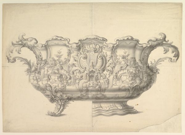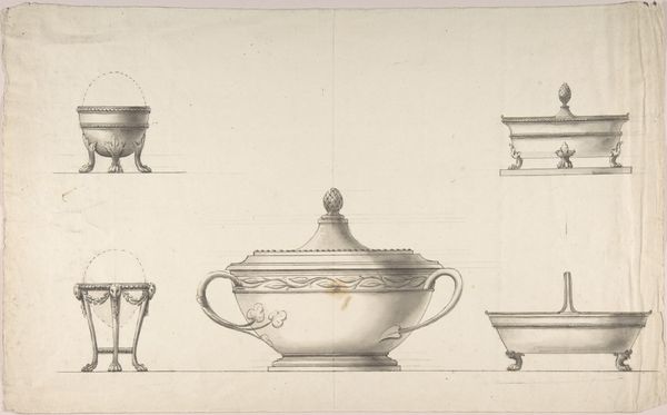 Editor: Here we have Giulio Romano’s "Design for a Basin with Three Satyr Heads and a Handle of Branches," a pencil drawing from around 1515 to 1525. I’m struck by the… the almost playful menace of it, if that makes sense? The satyr heads are rather unsettling, but then the handle made of branches feels organic and whimsical. What do you see in this piece? Curator: Playful menace! I love that. It's precisely the kind of tension that zings through a lot of Renaissance design. Think about it – these were times of tremendous upheaval, artistic blossoming, and, well, really questionable personal hygiene. This drawing feels like a wrestling match between classical ideals and something…wilder. I always imagine Romano sketching this with a smirk, knowing he's twisting expectations. It’s just… cheeky! Do you see how he’s almost winking at us through those satyr faces? Editor: I see what you mean. It’s definitely not as serious as I initially thought. It's as though it has two stories to tell simultaneously – one refined, one kind of unruly. Curator: Precisely! He’s nodding to the harmony and beauty they adored during the Renaissance, then whispers this naughty little secret – that chaos and absurdity are always nipping at our heels. The way he's rendered the texture of the branches is incredible too. Imagine this basin actually existing – the sheer opulence. How delightful! What a strange piece! I'd put olives in it! Editor: That's fascinating. I had seen it as an odd combination but I missed the intent. Thank you so much. Curator: My pleasure. It's these little tensions that make art so deliciously human, wouldn’t you say?