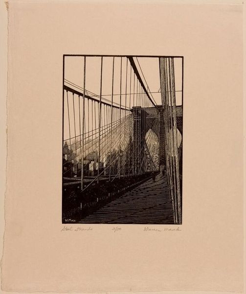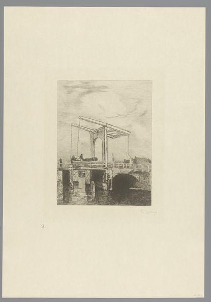 Curator: There’s something so melancholic about this piece, this etching of the Old Toll Bridge in Stratham, New Hampshire by Childe Hassam. It feels like a memory fading at the edges. Editor: Fading perhaps, but also revealing. Look at the density of the lines describing the wooden structure, the clear labor involved in building and maintaining such a bridge. Curator: Yes, that’s the contrast, isn’t it? The bridge itself, so solid and functional, rendered with such delicate, almost hesitant lines. I wonder what Hassam was thinking about as he etched it? Editor: Probably the same thing as the carpenters who built the thing, keeping folks moving, commerce flowing. The bridge as infrastructure, as connection. Curator: It’s interesting how he chose to depict it with that almost ghostly reflection in the water. It softens the whole image, adds a layer of dreaminess. Editor: Or perhaps it’s a reminder of the bridge's physical connection to the river, the material reality that sustains it. Curator: I see it more as a meditation on time, on what remains and what disappears. Editor: Maybe it’s both. Bridges join and allow passage, but also represent points of crossing, of choice.