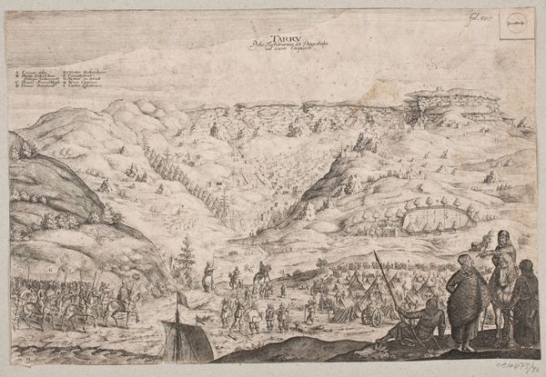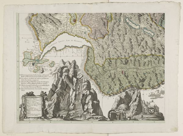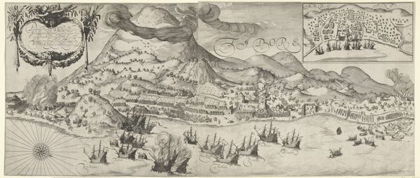 Curator: At first glance, this piece feels incredibly intricate, almost obsessively detailed. There’s a sense of vastness, yet it’s all rendered in tight, controlled lines. Editor: That’s a great way to put it. We’re looking at “The Inn Valley from the series Civitates Orbis Terrarum, vol. V, plate 59.” It's an engraving dating back to 1590, part of a larger project documenting cities and landscapes across Europe. The artist is Simon Novellanus. Curator: It definitely has that meticulous cartographic quality characteristic of the period. The rendering of the mountains, especially—it evokes a sense of enduring strength, of nature’s imposing power over the tiny figures below. There is an emblematic feel. It feels less about individual emotion and more about the lasting monumentality. Editor: Notice the four distinct panels? Each offers a different perspective. In Renaissance thought, different views of the same place offered deeper symbolic understanding and a connection to antiquity. Curator: Absolutely. The top panel establishes an almost panoramic view. Those cultivated fields in the middle distance bring to mind ideas of dominion and control over the landscape, very telling of Renaissance humanism and that drive to master one's environment. Editor: I see the symbolic importance too. Take, for instance, that central structure in the lower right panel—almost like a small cage. It begs interpretation in the context of imprisonment, or protection. Curator: Possibly. It could also symbolize the limitations of human knowledge or experience in contrast to the expansive, unknowable nature surrounding it. Medieval art is all about allegory. Editor: Agreed. The consistent style, however, reinforces its cohesiveness as a larger composition rather than discrete images, tying these views together despite their different perspectives. A complex symbolic encoding for its time. Curator: This work really reminds us of the intersection of cartography, art, and symbolism in the late Renaissance. A window into how they understood the world—literally and figuratively. Editor: And a striking demonstration of the enduring power of meticulously rendered line work to convey both physical space and cultural meaning across centuries.