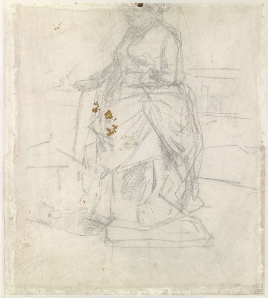 Wilhelm Marstrand made this drawing of a seated woman with graphite on paper. It's a quick study, rapidly drawn, with soft lines suggesting the form of the figure. The artist paid close attention to the fall of light on the woman's clothing, using delicate shading to create a sense of volume. The visible texture of the paper adds to the sketch's informality, reminding us of the artist's hand. Marstrand likely executed this drawing as preparation for a larger painting. The immediacy of the graphite medium allowed him to capture the pose and expression of the model. In its apparent simplicity, the drawing reflects Marstrand's deep understanding of academic artistic traditions. Yet, it also has an off-the-cuff feel that makes you consider the role of labor and production in the art process. What seems like a simple sketch represents hours of technical training, and is an intimate window into the artist's process.