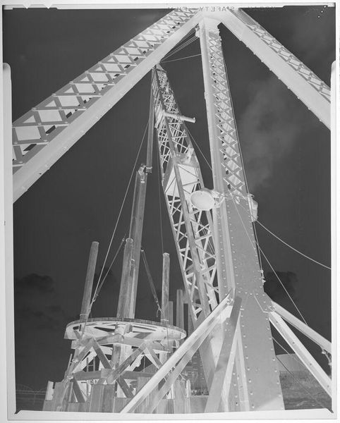 Editor: This Jack Gould photograph, "Untitled (bridge construction, long cables)," presents a stark, almost ghostly image. The bridge under construction dominates, but in this negative image it feels fragile, almost temporary. What do you see here? Curator: Notice how the skeletal bridge form mirrors our own human drive to connect, to span divides? The cables, like lifelines, evoke a sense of both aspiration and vulnerability. It reminds us that every structure, both physical and societal, is built on unseen foundations. Editor: That's fascinating! I hadn't considered the bridge as a metaphor itself, rather than just a structure. Curator: Consider, too, the negative space – it gives the image a dreamlike quality. The bridge, in this inverted reality, becomes a symbol of potential, of futures yet unwritten, held in the balance.