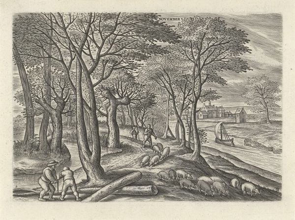 Editor: So, this print is called "Mei", made around 1560-1652 by Julius Goltzius. It’s an engraving, and it's currently at the Rijksmuseum. I'm really drawn to the sense of community and the focus on daily life, it seems like everyone's just enjoying the start of summer. How do you interpret this piece? Curator: It is remarkable how Goltzius captures the exuberance of May, isn’t it? It’s less a snapshot and more a carefully constructed representation, brimming with symbolism. Think of the May tree celebrations, ancient rituals honoring fertility and the renewal of life after the long winter, and its pagan connotations, that are deeply ingrained in European culture. Does that resonate with you? Editor: Absolutely. I notice the people are gathering in different clusters around the print. Some are dancing, others are having picnics, which I suppose speaks to how communities bond through shared experiences. Curator: Precisely! Note the figures dancing. Dancing was often associated with abandon and earthly pleasures, a releasing of societal constraints especially around springtime festivals, while a bountiful table of food represents plenty and community. Editor: So, even seemingly mundane scenes contribute to the overall symbolism? It feels like the artist embedded many layers. Curator: Everything contributes. Consider how landscape itself represents more than just a backdrop. Here, the flourishing landscape represents the reawakening of nature and of human desire, something of a return to the Garden of Eden. Every detail has meaning. Looking closer at details, we can also understand this artist's memories of cultural values. Editor: That is fascinating! Thanks to your perspective, I now see how this print speaks volumes about Northern European society, its symbols, values, and rituals. Curator: And by analyzing its iconography we’ve also had a small glimpse into ourselves and the way these cultural echoes can still resonate.