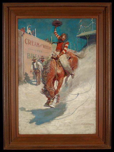 N. C. Wyeth made "Rural Delivery (Where the Mail Goes)" with oil on canvas. Look at the way Wyeth's brushstrokes build up the form of the horse and rider. It's like he's thinking through the process of how something appears in space. The material quality of the paint is really on display here. See how the thick strokes create texture, especially in the horse’s mane and the rider's vest? The way the light catches those ridges adds a real sense of depth and physicality. Then, compare that with the smoother, more blended strokes in the background, giving the piece an overall dynamic feel. The eye is drawn to the focal point by the contrast of the details. Think about how the title “Where the Mail Goes, Cream of Wheat Goes” plays with the idea of art as a form of communication, a way of sending ideas and stories. This piece isn't just a picture; it's an invitation to imagine the rural experience. This tension between narrative and form is something we also see in the work of illustrators like Norman Rockwell. It’s a reminder that art doesn’t have to be one thing or the other; it can be both representation and pure feeling.