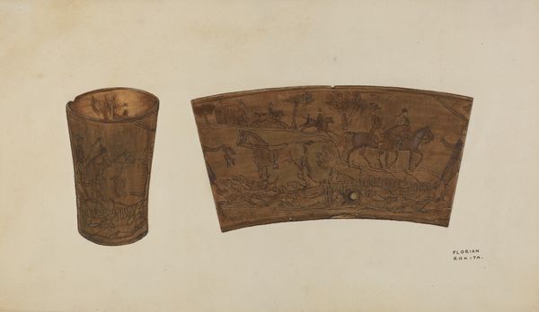 Curator: What immediately strikes me about this work is its incredible detail; it feels almost photographic in its realism, yet it clearly has the warm touch of hand craftsmanship. Editor: Absolutely. Cecil Smith’s “Double Rig Saddle,” created around 1938, presents us with more than just a rendering of a saddle; it presents a portrait of labor and the culture that produced it. It encourages us to reflect on American identity and class. Curator: Indeed. The deep browns and careful renderings evoke a sense of tradition and a perhaps romanticized vision of the American West. I notice how the tooling on the saddle depicts foliage, in the way that nature itself becomes entwined in cultural production. We find symbolic relationships there. Editor: It's an object imbued with meaning, undoubtedly. I wonder about the intended audience during this period, during the height of the Depression, for whom this representation might offer solace, reaffirmation, or perhaps something more complex. The aesthetic here does engage in questions of race and social justice through a certain kind of nostalgic lens. Curator: Perhaps. The craftsmanship evident in the artwork serves as a powerful symbol of perseverance. The saddle as artifact itself, divorced from its inherent functionality, has this function for the viewer here. It’s more than leather and dye, though. It's also deeply embedded within a very particular cultural and historical narrative that we continue to grapple with today. Editor: Right, the iconography of the American West persists. And by deconstructing and examining it in pieces here, like the sections presented to the viewer on the surface of this work, Smith challenges us to think critically about its symbolism. This isn’t just any saddle; it’s a powerful object representing mobility, expansion, labor, class, and ultimately conquest. It leaves me to reflect on its cultural importance and where it leads us now. Curator: Precisely. This work sparks conversations that delve deeper into not only American culture, but how it portrays itself both internally and externally.