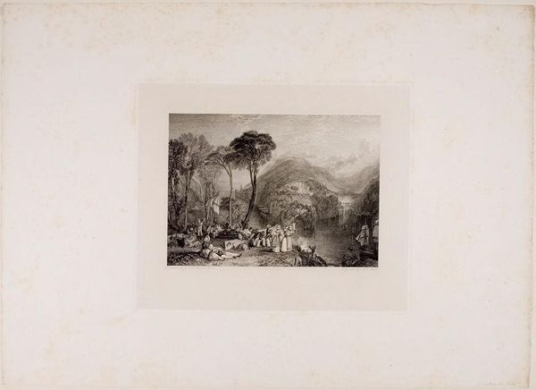 This print, "Western figures amidst a procession and offering figures," was created by Hendrik Rudolph Roelfsema. Roelfsema's lithograph presents a detailed scene, meticulously composed within an oval frame, lending the image a sense of containment. Linear precision is evident throughout. The arrangement invites us to consider power dynamics and cultural interfaces through the structure of the image. The interplay between the native figures and the Westerners is rendered through the precise lines that delineate their forms and position them within the landscape. Roelfsema skillfully directs our gaze towards the act of offering, a cultural performance laden with symbolic meaning. This structured layout may reflect the semiotic relationships inherent in colonial encounters. Notice how the formal elements create a narrative—one that compels us to interpret this scene not just as a picturesque moment, but as a structured representation of cultural exchange and power.