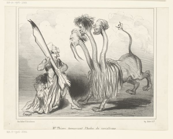 Editor: This lithograph by Honoré Daumier is titled *A Little Old to Play the Colossus of Rhodes.* The figure seems unsteady, weighed down by her robes. What do you see in this piece, especially considering the political climate of the time? Curator: Daumier's cartoon encapsulates the fragility of diplomacy in the face of pressing issues. The "Colossus" represents diplomacy, but its age suggests it’s out of touch. Note how it awkwardly straddles the "Italian Question" and "Eastern Question"—aren't these the very geopolitical tensions that diplomacy should be addressing, yet seems unable to bridge? Editor: So, it's a commentary on the ineffectiveness of diplomacy then? Curator: Precisely. It urges us to consider whose interests are being served by such unsteady, performative diplomacy. It makes me wonder, whose voices are absent? Editor: I see it now, the cartoon is not just humorous; it's a critique of power itself. Curator: Exactly, art as a mirror reflecting the complexities of societal power dynamics.
