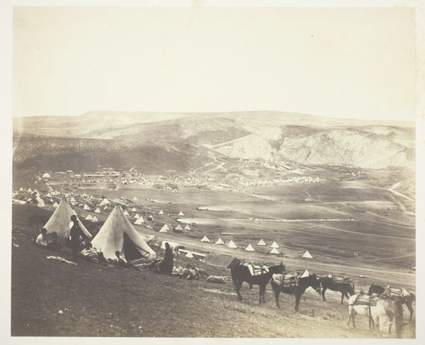 Roger Fenton captured this photograph with a camera in the mid-19th century, showing a military encampment, possibly during the Crimean War. Tents and a line of horse-drawn wagons dominate the scene, symbols of transient existence and the logistics of conflict. Consider the tent, a motif echoing through time. From nomadic tribes to modern refugee camps, the tent represents shelter and community in times of displacement. Its peaked shape, reminiscent of ancient pyramids or even a soldier's hat, resonates with themes of protection, hierarchy, and mortality. The wagons and horses evoke images of classical war chariots. Across millennia, these symbols recur, transforming from instruments of glory to tools of grim necessity. It's a striking reminder of war’s cyclical nature, where progress often leads us back to primal struggles, engaging the viewer on a subconscious level.