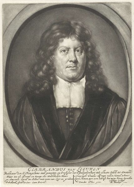 This is a portrait of Gerbrand van Leeuwen by Pieter van der Plas, made in the Netherlands in the late 17th or early 18th century. Van Leeuwen was a pastor in Amsterdam and professor of theology. The portrait uses visual cues to present the subject in a way that reinforces his social position. The oval frame and formal pose lend the image authority. The sitter's hand is posed in such a way as to imply both learning and control. This image, and others like it, would have been used to reinforce the status of religious leaders in Dutch society. As art historians, we can use sources such as church records, university archives, and other period portraits to learn more about the social and institutional context of this image and the role it played in shaping public perceptions of religious figures like Gerbrand van Leeuwen.