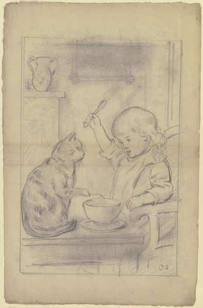 Curator: Well, what a charming domestic scene we have here! This is "Girl Feeding a Cat" by Heinrich M. Krabbé, and while its precise date of creation isn't known, we place it somewhere between 1878 and 1931. Krabbé worked with watercolor on paper for this piece, which is currently held at the Rijksmuseum. Editor: It’s sweet, isn't it? Makes me think of simpler times, but there's also something… slightly unsettling about it. Perhaps it's the muted greens, or the fact that she's pouring from a teapot onto a saucer like they’re having tea! It almost feels like a dream I once had. Curator: The muted tones are indeed characteristic of the period and perhaps indicative of a more somber emotional landscape. What might seem saccharine to our eyes might have carried a heavier symbolism back then. The act of feeding itself—offering sustenance—carries layers of cultural and spiritual meaning, signifying compassion, nurturing, and a connection to something beyond oneself. Even the image of a cat. They've held multiple meanings over the centuries. In some cultures, cats are symbols of independence, and even female strength. Editor: Oh, I like that interpretation, seeing her there with this little furry independent spirit, sharing. Although… and this might sound silly… does anyone else get a slight sense of formality from the setup? Like this is a staged tea party for two in a little fairytale land. Or she is pretending to be mother feeding a child. Curator: Well, it speaks to how even the simplest gestures carry so much cultural baggage. Consider the act of miniature creation itself! Often intended as objects for instruction, and tools to communicate status in the household. Also, it reminds us that miniatures frequently act as vessels to transmit values across generations. Editor: True. It's funny how something that looks so straightforward opens up so many windows. Curator: Precisely. Hopefully this glimpse at this little scene gives us cause for more pondering on visual cues and quiet connections in art and the human condition. Editor: I totally agree. It also has made me think about getting a cat.