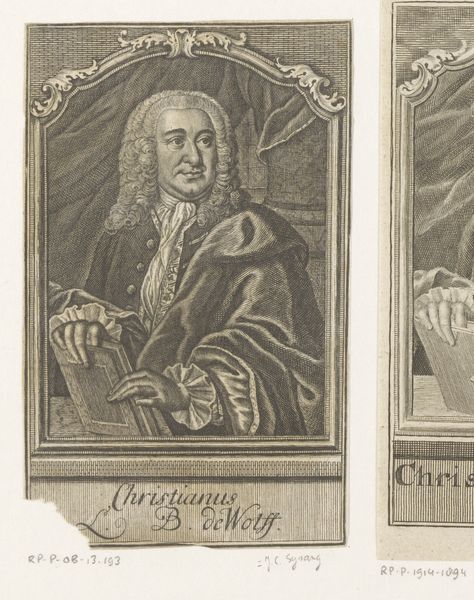 Editor: This is "Portret van Christian Pfeiffer von Palmencron," a 1732 print by Johann Martin Bernigeroth, currently residing at the Rijksmuseum. It’s striking how the textures of his wig and coat are rendered with such fine lines. The oval composition also adds a nice touch. What do you see in this piece? Curator: Formally, the most compelling aspect of this engraving lies in its deployment of line and contrast. The parallel hatching technique generates a nuanced tonal range, effectively modeling the subject's face and clothing. Consider the density of lines in the shadowed areas, creating a three-dimensionality despite the inherent flatness of the medium. Observe the use of curved lines, particularly within the wig. Does this linearity contribute to a sense of controlled ornamentation, perhaps alluding to the sitter's societal position? Editor: Definitely. The lines almost create a fabric-like effect. So the density and direction contribute to the overall effect, like weaving. Curator: Precisely. It is through such manipulation of line that Bernigeroth constructs a portrait that speaks not merely to representation but also to the artistic potential immanent within the engraving itself. Editor: It's amazing to consider how the simple technique creates such complex visual textures. It has completely shifted my way of seeing the piece. Curator: Indeed. This examination illustrates the capacity of formal analysis to disclose intricate, underlying dimensions within seemingly simple portraiture.