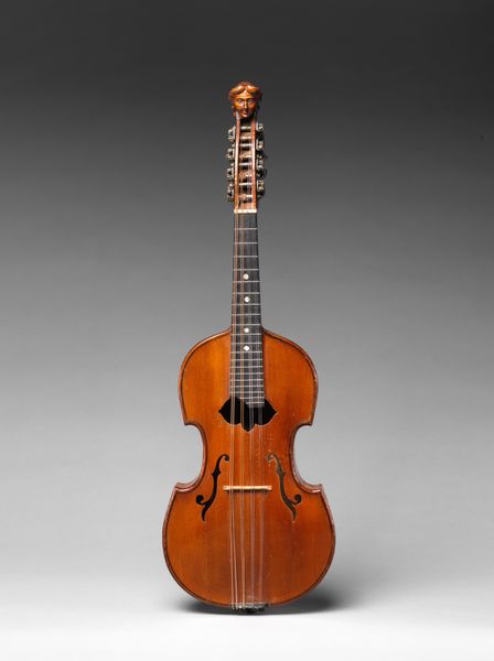 Editor: Here we have Johann Georg Staufer’s "Arpeggione" from 1831, residing here at the Met. It's crafted from wood, and it appears to be some kind of cello relative... The smoothness of the wood and the symmetry of the piece is striking. What compositional elements stand out to you? Curator: Primarily, I am drawn to its construction: Observe the six strings as opposed to the more familiar four, requiring a wider fingerboard and altered playing technique. And note the relationship between the curves of the body, how they resolve to create a unified, visually harmonic form. Does that harmony evoke Romantic ideals? Editor: Absolutely! There's a certain longing communicated just in the form itself. But what do you make of the star detail at the headstock? Curator: It introduces an element of geometric contrast amid the organic curves. Perhaps a symbol of aspiration or transcendence, disrupting the otherwise smooth flow and adding visual complexity to the object. Does its placement strike you as significant? Editor: It’s definitely focal, and it contrasts nicely with the dark wood. It's clear Staufer paid close attention to both visual and tactile details, to build the image, not just the instrument itself. Curator: Precisely. Each choice impacts the overall aesthetic. By attending to the nuances of line, shape, and material, the luthier shapes our perception of not just sound but artistic expression. The totality produces this feeling of romanticism. Editor: I appreciate your point about the unified form! Now, I have a much richer understanding of how intentional Staufer was with its structure and style. Curator: Indeed, seeing how parts create wholeness is the real education here.
