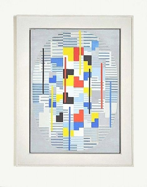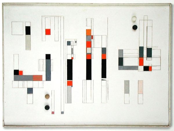 Curator: Adolf Fleischmann's "Nr. 39a" from 1955. An exemplary instance of concrete art painted in acrylic. Editor: Striking, isn't it? My first thought is about its intense clarity and precise arrangement of forms, there is an underlying sense of balance even as it feels dynamically offset. Curator: Precisely. What we’re seeing here is deeply influenced by Constructivism, particularly the emphasis on geometric abstraction. Fleischmann, of course, was engaging with wider European dialogues around social change post-war. The interplay between forms also embodies critical issues of reconstruction through fragmentation. Editor: When looking at this, my focus drifts to Fleischmann’s calculated selection of materials, and his active decision making as the maker and selector. This wasn’t just sketching something out on canvas; it involves deliberate labor with acrylic and compositional consideration. Curator: Indeed. Fleischmann rejected representation, creating purely abstract forms meant to evoke an experience beyond the physical world. He uses simple forms to articulate his thoughts. If we contextualize his time within post-war thinking, can we understand his simplification of geometric form, to address larger social change and trauma, for example? Editor: Definitely. But consider how each choice of pigment carries inherent values tied to consumption and availability; in the use of colors, he reflects and engages with what it meant to exist materially as an artist in 1950's Germany. How were materials obtained? Curator: The color palette echoes a certain Bauhaus sensibility, I see. But look at his use of color to challenge conventions. Do you notice the lines between primary colors creating tension, almost? Are they creating separate identities here? This speaks about challenging art with social critique, doesn't it? Editor: Definitely. While that tension might be true in part due to colors, the grid structures are integral, also: How did he go about meticulously composing these geometric blocks? That deliberate hand craft should never be discounted as simply form; instead, its a dialogue between artistry and material, engaging at both the micro and macro levels. Curator: Very well articulated. Overall, Fleischmann provokes a lot of challenging questions by synthesizing social implications and pure form. Editor: I agree. Its geometric precision, the materials, speak for themselves; but when engaging, we must question all these complex social implications tied into abstraction.