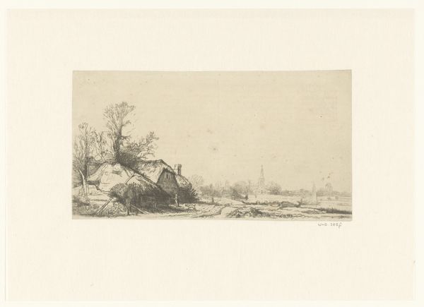 Editor: So, this is "Boerderij bij de Waalsdorperweg," or "Farm near Waalsdorperweg," by Johannes Bosboom, sometime between 1827 and 1891. It's a drawing using pencil and pen. I find the sketchiness quite charming, but I am unsure where to begin with interpreting it. What stands out to you most in terms of its composition? Curator: Initially, the asymmetrical arrangement of forms arrests the eye. The stark contrast between the clustered, almost overgrown, left side and the sharp angles of the barn structure on the right generates a palpable tension. Notice how the varying densities of pencil strokes articulate space. Where do you see evidence of artistic choices that seem deliberately structured, rather than merely representational? Editor: I see it in the way the light seems to catch on the roofs. The strong diagonal lines of the main building lead my eye to the centre and then the density of foliage on the left creates depth but seems very deliberate. How does this deliberate contrast inform our understanding of the piece? Curator: It introduces a play between the man-made and the natural. Bosboom sets up a visual dialogue, not just through subject matter but through the very application of the medium. The formal elements—line, value, texture—become actors in a semiotic drama. Is this balance between elements pleasing or unsettling? Editor: I think the composition leans slightly towards the unsettling, the darkness feels like the encroaching wild overwhelming the farm itself. It's subtle, though. So, essentially, Bosboom isn't just representing a landscape. He’s constructing an argument through form and composition. Curator: Precisely. By focusing on the visual mechanics, we gain insight into Bosboom's deeper intentions. This analysis moves beyond mere depiction towards deciphering a visual language, and its emphasis on artistic style adds significant complexity. Editor: This new viewpoint gives me a richer appreciation of the artist's technique and a new approach for analyzing compositions and the tension the style is trying to convey. Thank you!