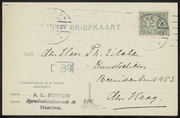 Editor: Here we have Anton L. Koster’s "Briefkaart aan Philip Zilcken," likely from 1909, crafted with mixed media, ink, and drawing on paper. There’s an intriguing layering of marks, stamps, and elegant calligraphy that speaks of another era. What resonates with you when you look at this? Curator: It's the accumulation of symbols, the visual language of bureaucracy and personal connection interwoven. Notice the official stamps: The crowned emblem of the Netherlands signifies authority, a promise of the postal service. What psychological effect does superimposing those images, designed to control flow, on the handwriting of personal address? Editor: It creates an interesting tension. It seems almost rebellious. Curator: Precisely! A mundane object like a postcard transcends mere function; it embodies the societal structures that framed everyday life. It begs the question: Did the average citizen even recognise these emblems? Do such things still carry psychological weight today? Consider the sender's address. Haarlem was an artistic hub; what does that detail whisper about the network of artists exchanging ideas and support? Editor: The handwritten address itself, “den Heer P. Zilcken, Kunstschilder" directly translating to "the gentleman P. Zilcken, Artist". How do name and title function as an emblem? How important do you think personal branding was to the average artist? Curator: That’s insightful. Addressing Zilcken directly as an artist is itself symbolic, asserting professional identity and respect. It shows their place within their circle. Even seemingly innocuous design elements communicate volumes about cultural values and personal aspirations. Editor: This has really opened my eyes to how much an everyday item like a postcard can tell us. It is so interesting to understand its embedded layers of cultural meaning. Curator: Indeed. And by reading such images critically, we gain deeper understanding of history, psychology and of ourselves.