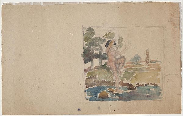 Curator: Welcome. Here we have Mark Rothko’s watercolor and drawing on paper, "Cows in a Landscape", created around 1929. Editor: Oh, wow, that's earlier than I expected from Rothko. It has a quiet feel to it, a pastoral dream almost. Kind of surprising considering what he later became known for, right? Curator: Precisely. It's an insightful juxtaposition to his later abstract expressions. Here, the structure is based on identifiable forms: cattle in the foreground, a quaint countryside punctuated with buildings nestled into an open vista. The perspective operates traditionally enough with compositional depth built through layered planes of color. Editor: Planes of color is so right. See how he defines those cows with just the faintest touches? The landscape is implied more than declared, isn't it? Almost as if the scene is remembered, not directly observed. Sort of like a fleeting impression. It feels very... personal, like peeking into someone's happy memory. Curator: We might consider his application of the watercolor medium itself. The diluting and layering allows the white of the paper support to remain visible. It's this layering technique that establishes tonal variation across the image plane. It establishes a visual tension with Rothko’s commitment to figuration here. Editor: Figuration. Right, there are definitely cows, but it's also drifting. Like the shapes want to become something else. The houses are little blobs. This reminds me how reality blurs, even during daytime! It captures the inherent vagueness of trying to hold onto a complete picture in the mind. And the whole plein-air feeling is strong; you can almost sense the air on your skin and sunlight in the meadow. Curator: In a similar vein, the rendering and coloring do echo characteristics inherent to the stylistic traditions of Realism. The idyllic subject matter suggests pastoral scenes, perhaps intentionally calling to the tradition of landscape paintings in western art. Yet, one senses Rothko stretching, pushing the boundaries to a different mode of perception. Editor: He certainly did. It's kind of comforting seeing where he started. Even the greats take routes you don't expect. Maybe this even holds a lesson of valuing simple observations before you attempt abstractions of them! Curator: Indeed. This "Cows in a Landscape" acts as a visual anchor. Considering its place within Rothko’s career, one gains insight regarding artistic development, technique, and even potential motifs present throughout his oeuvre. Editor: What an insightful glimpse into the roots of his later artistic pursuits. Made me feel I was seeing something sacred.