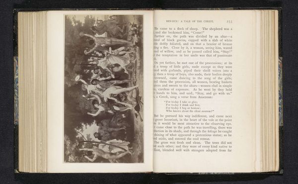 Curator: I’m struck by the overall ethereal quality of this image—a kind of dreamscape, would you agree? Editor: Yes, it has that effect. This is a photogravure print called “Fotoreproductie van een schilderij, voorstellende Muzen in het heilige bos”—A Photographic Reproduction of a Painting, Depicting Muses in the Sacred Grove. We attribute it to an anonymous maker, placing its creation before 1888. The Rijksmuseum holds this specific impression. Curator: “Sacred Grove”... Given the way the figures float within the composition, there's almost an archaic pre-Christian feel, perhaps a longing for a classical Arcadia. The photograph flattens the textures and contrasts into starker symbolic contrasts. Editor: Indeed. One might consider the print within the context of late 19th-century visual culture, amidst growing museum culture and expanding image reproduction technologies. It shows the circulation of art beyond its original physical form. How did that reshape perceptions? Curator: Precisely! The democratization of imagery reshapes cultural memory. Each symbol – the muses, the forest itself – takes on new layers with mass consumption, diluting but also broadening interpretations across various social classes. Does this impact their intended gravitas? Editor: That's an excellent question. By transforming this unknown painting into a widely accessible print, was its original symbolic power subverted, or rather amplified? It enters dialogues of artistic exchange. Is this ‘holy’ in any institutional way? Or only emotionally? Curator: Good point, and to extend that: How much is 'lost' versus gained through reproductive technology? On one hand, it loses the unique touch of the artist, its unique aura. But is aura elitist, or culturally vital? On the other hand, photography may underscore key structural relationships in the painting more pointedly for larger audiences. The emotional connectivity to antiquity changes. Editor: Ultimately, this artwork provides insight into both the sacred power that images hold and the social factors dictating its impact on us. Curator: Exactly! And this "reproduction" makes me realize, photography reframes our relationship with art, turning it into a complex dialogue across time and media, memory, and perception.
