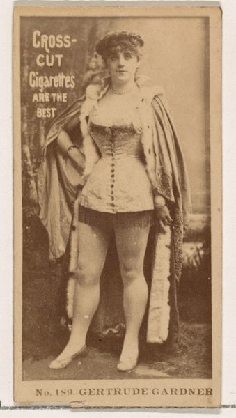 Curator: Looking at "Card Number 331, Von Oastan," one of the captivating prints from the Actors and Actresses series by W. Duke, Sons & Co. dating back to the 1880s, a certain playfulness strikes me instantly. Editor: Playfulness? The albumen print's sepia tone evokes a subdued mood, almost melancholic, yet her confident gaze and stance add a layer of dynamism. It feels poised between stillness and movement, a curious paradox. Curator: Indeed. The figure, Von Oastan, is framed almost theatrically; she's turned slightly to the side, not directly confronting the viewer, with very distinctive ornamentation to draw the eye. How does that speak to the construction of her persona, perhaps? Editor: It brings to mind the era’s celebrity culture. These cards, distributed with Cross Cut Cigarettes, reveal how tobacco companies influenced popular imagery. Von Oastan becomes both actor and advertisement. Her costuming and stylized setting transform her from person to commodity, reinforcing the connection between personal aspiration and mass-produced goods. Curator: Precisely, a semiotic system wherein she becomes a signifier. Notice her costume’s textures— the silk-like shawl, the floral detailing and lace. These invite us to contemplate the texture of desire itself that the brand exploits. Editor: And consider the objectification at play. The costume, arguably titillating in its display of her legs, reinforces the male gaze prevalent at the time. Cigarettes, marketed toward men, thus used the allure of women like Von Oastan as bait. The card’s miniature scale renders her into something easily consumed and easily discarded. Curator: And even within this tiny tableau, the stark lines of the depicted architectural detail contrasts to her costume adding another layer. Editor: Right, seeing this, it reminds us to ask, how does what is pictured, work to say, "Cross-Cut Cigarettes are the Best"? Curator: It really underscores how potent those commercial images of that time period remain as artifacts that are revealing.